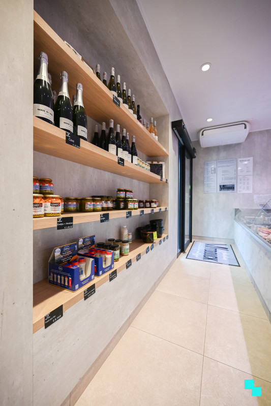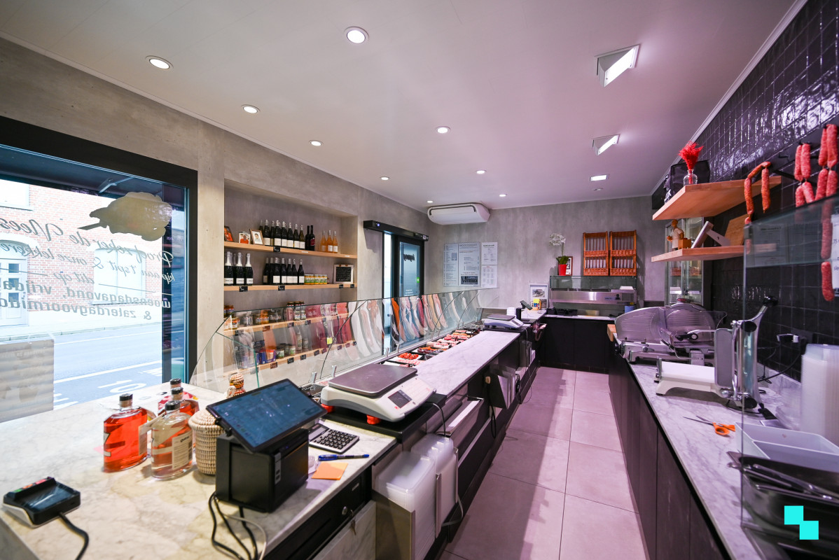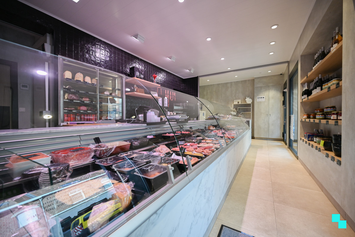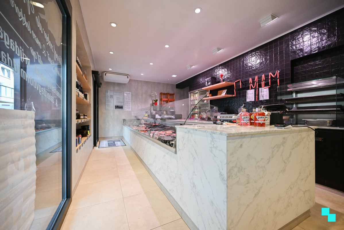 Vooraan bevindt zich de stijlvol vernieuwde winkelruimte, afgewerkt met kwalitatieve materialen, verzorgd maatwerk en een professionele uitstraling. Deze commerciële ruimte is volledig instapklaar en onmiddellijk inzetbaar voor een slagerij of andere handelsactiviteit.