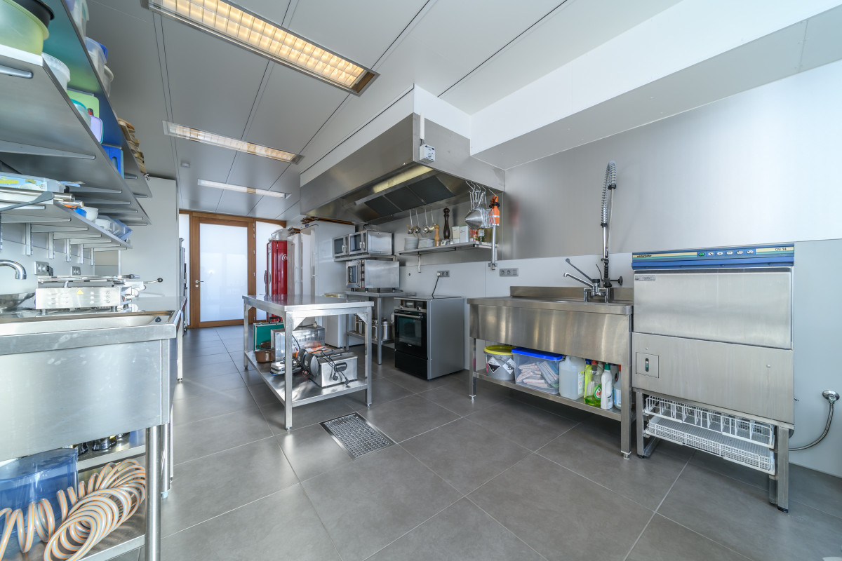 Na enige tijd werd het huisje aanpalend er bij gekocht, dit werd volledig afgebroken en er werd een volledig nieuwe constructie opgebouwd die resulteerde in een mooie verzorgde polyvalente ruimte van meer dan 200m² én extra woonruimte op het eerste verdiep. Als vloer is er gepolierde beton, er staat een handige keukenblok, verwarming voorzien, drijfkracht,... Vanuit deze ruimte is er toegang naar het café, het sanitair én het terras.