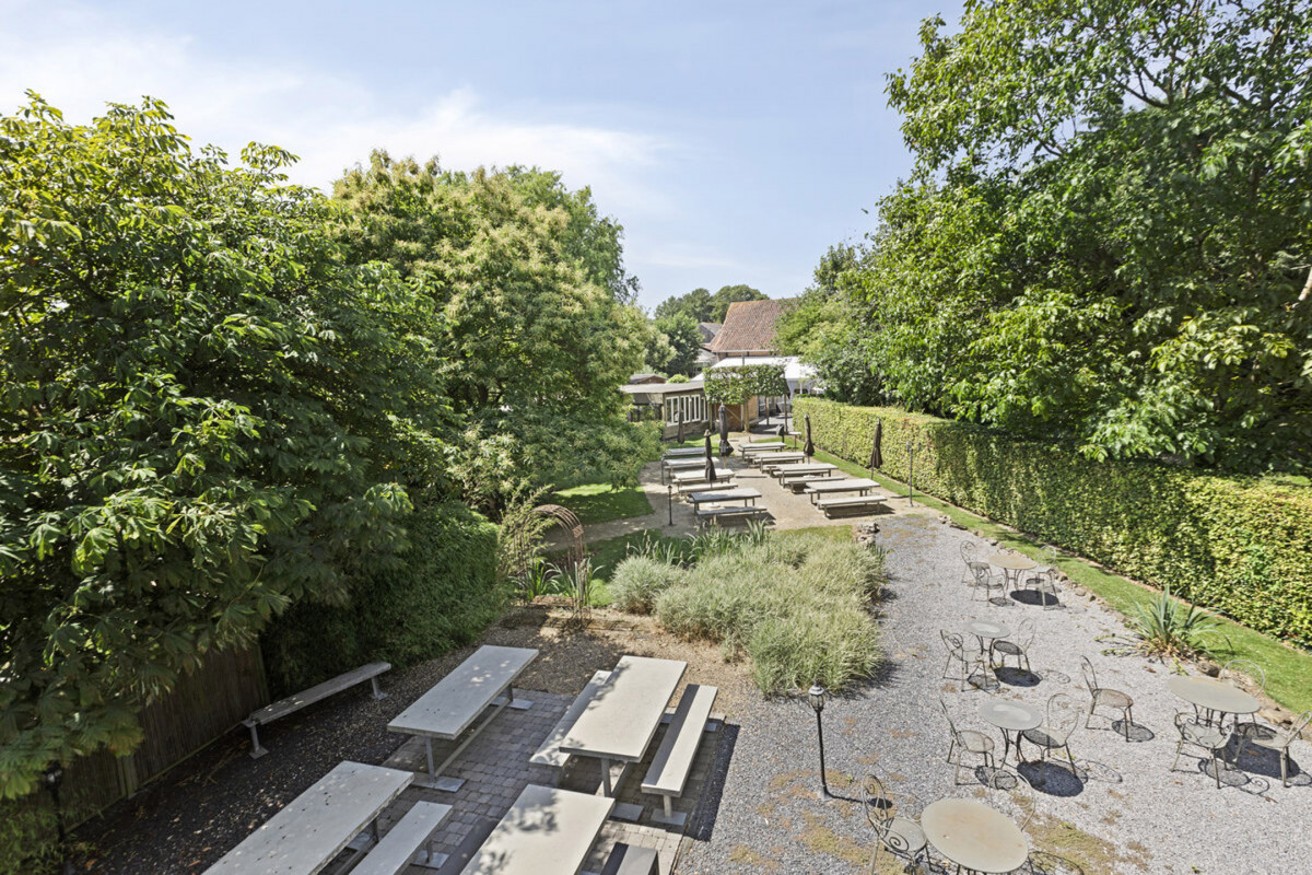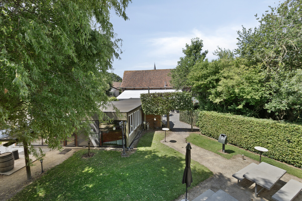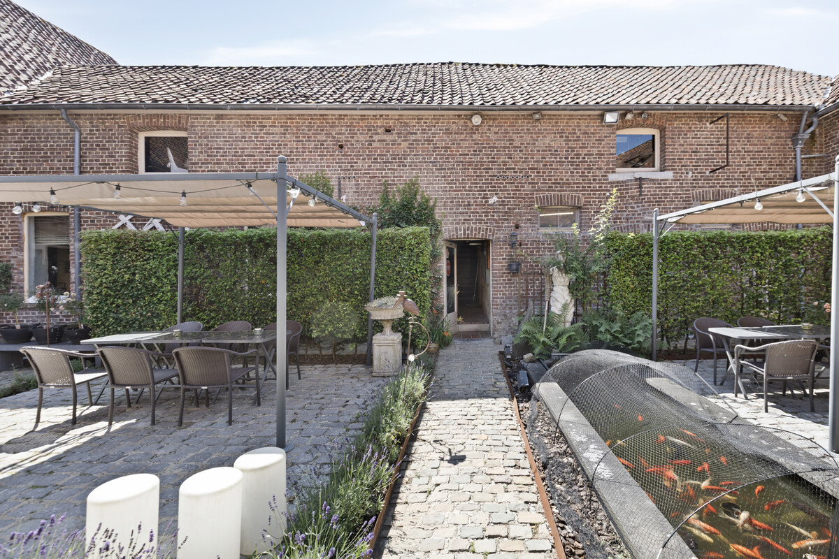 De hoeve is volledig opgetrokken in vierkantstructuur en verwelkomt u via een indrukwekkende houten poort. Deze leidt naar een charmante binnenkoer met waterpartij – perfect voor buitenrecepties, ceremonies of informele bijeenkomsten. De binnenkoer sluit naadloos aan bij de feestzaal en biedt toegang tot de keuken en bergingen.