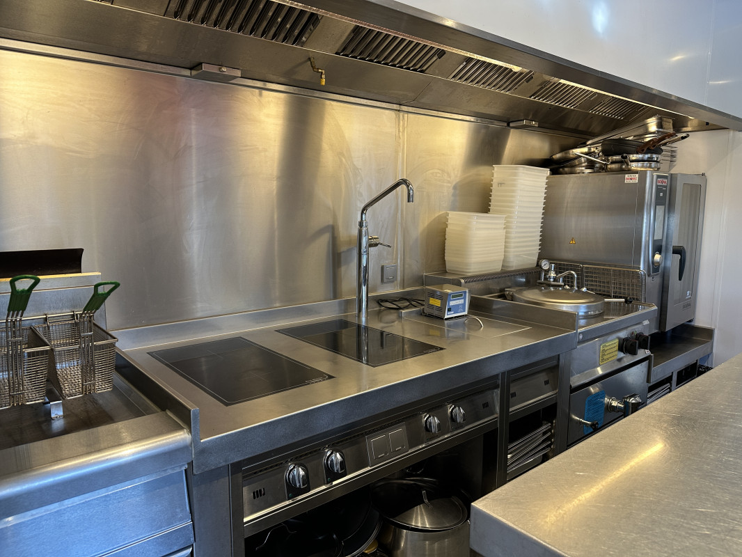 De hypergeïnstalleerde, op maat gemaakte keuken is bijzonder kwalitatief afgewerkt en uitgerust met hoogwaardige toestellen – een echte meerwaarde voor elke professionele uitbater.