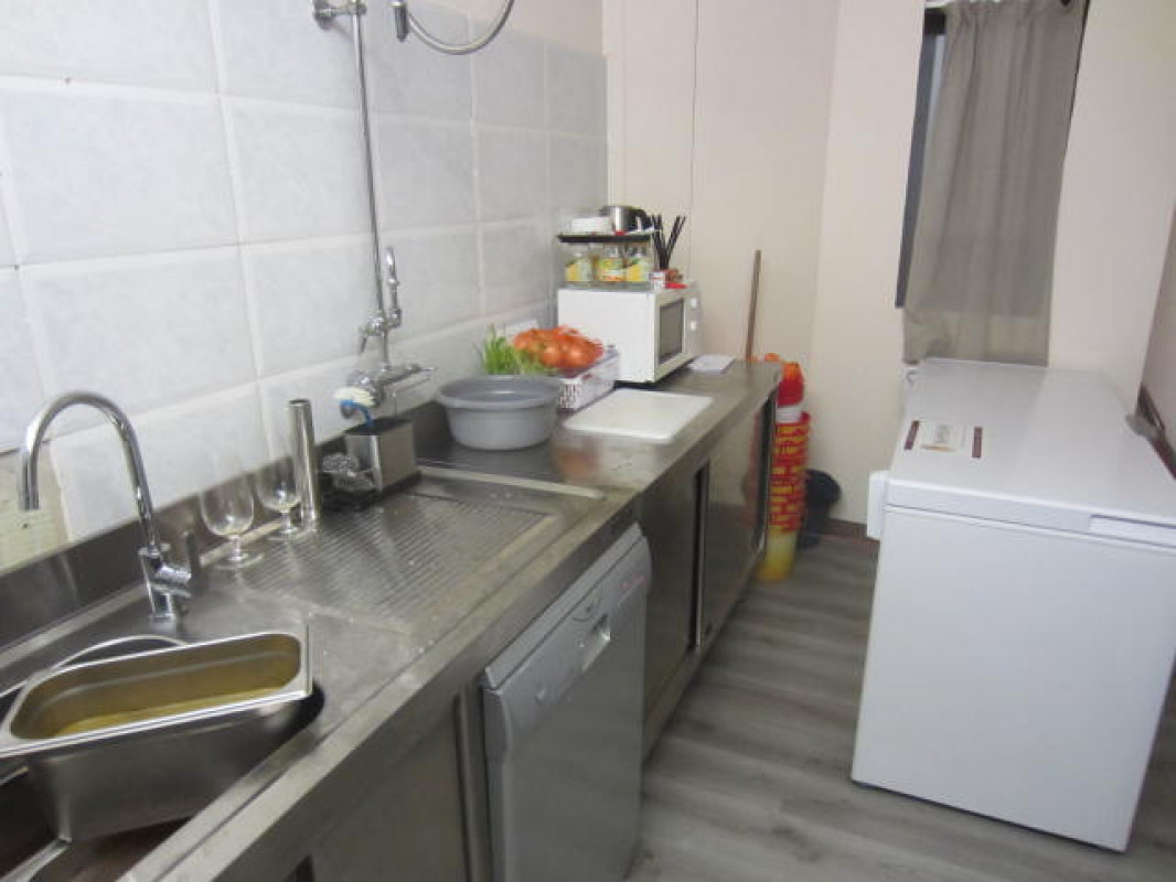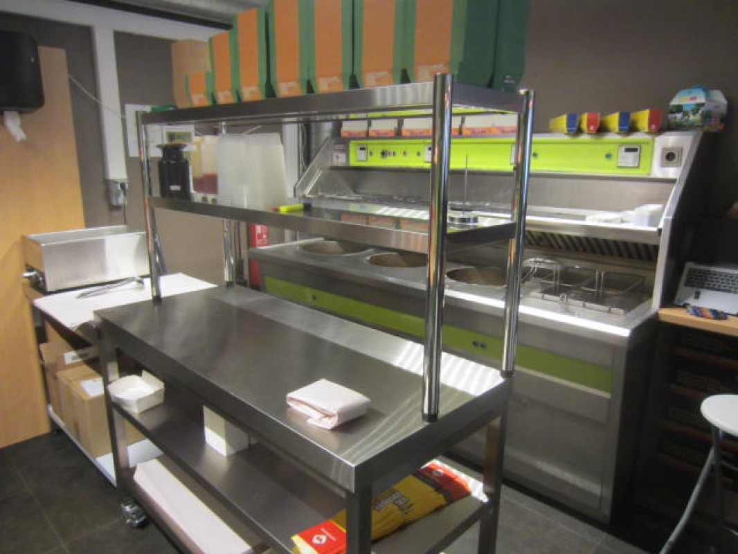 Een geïnstalleerde keuken met al het nodige materiaal waaronder drie diepvriezers waarvan één nieuwe , nieuwe inox tafels , nieuwe bain - marie nieuwe afwasmachine .
