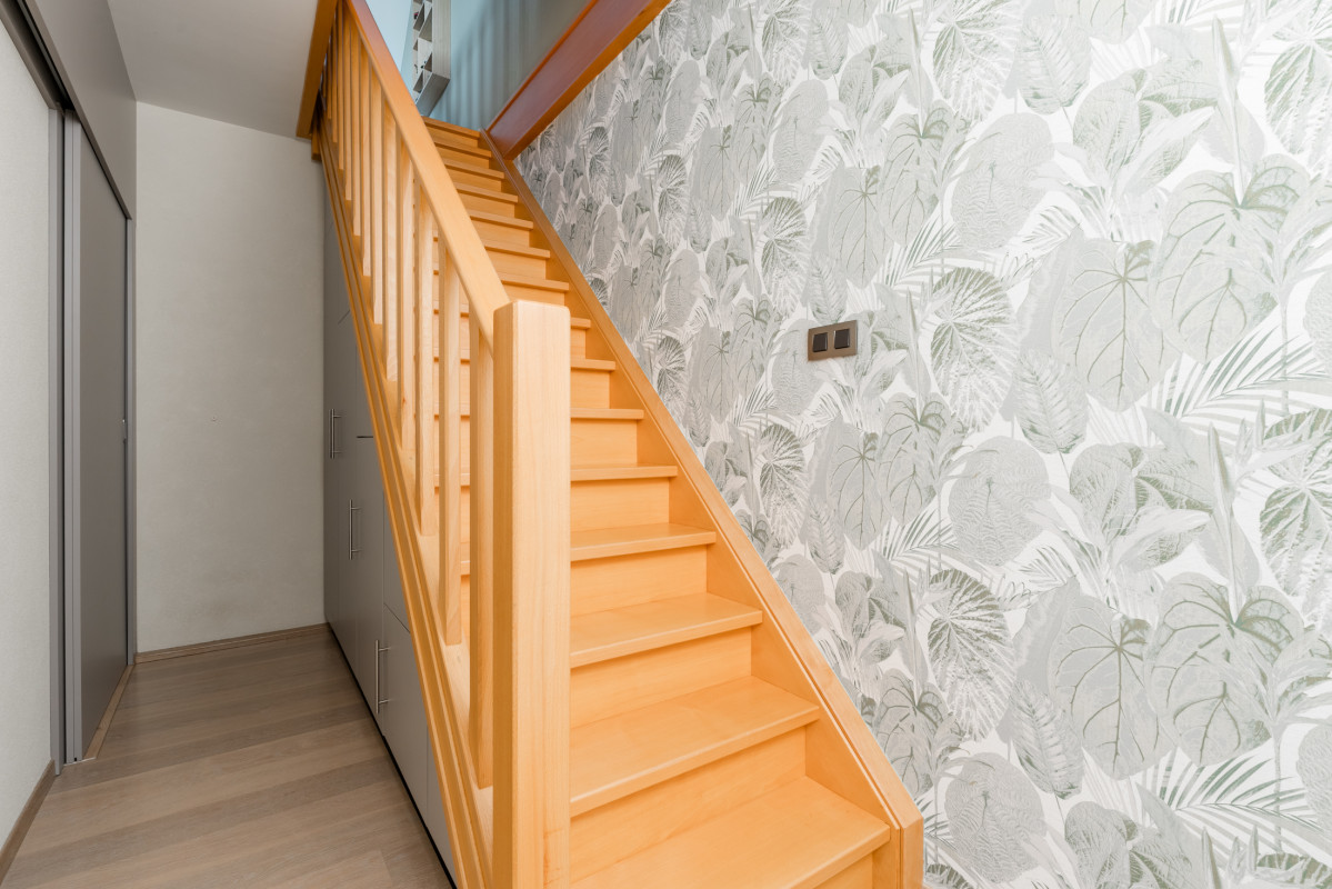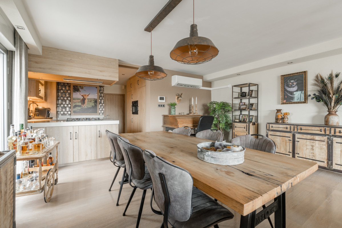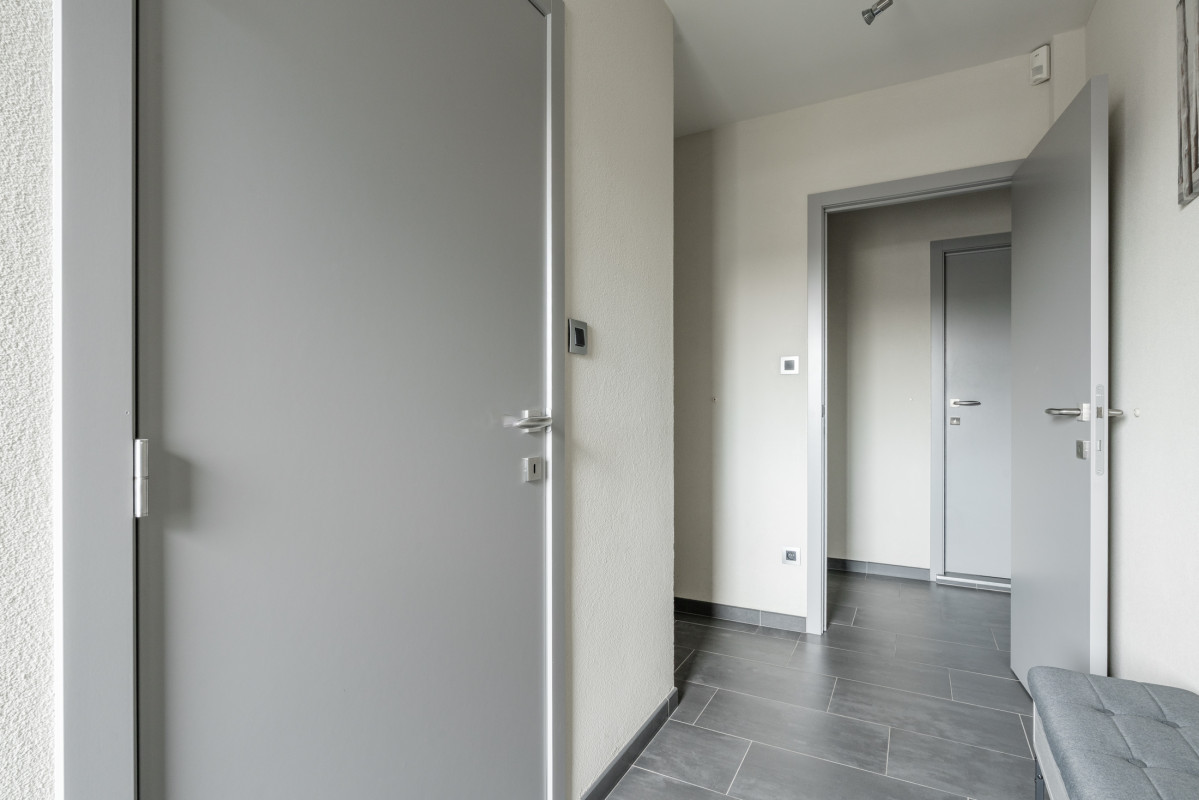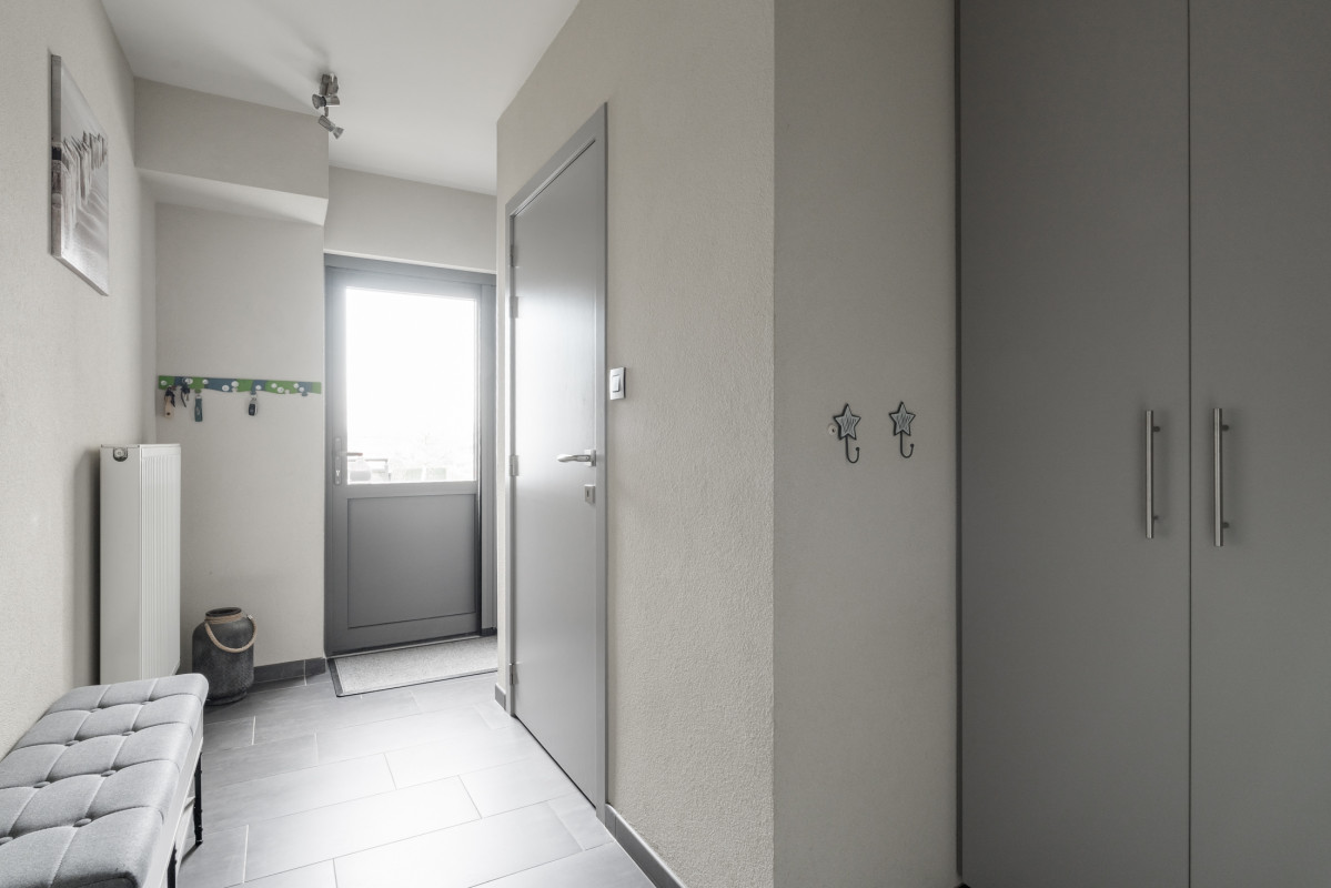 Het bovenliggende appartement, bereikbaar via een aparte toegang, biedt een bewoonbare oppervlakte van ca. 122 m² (bron EPC), verdeeld over de eerste en tweede verdieping.