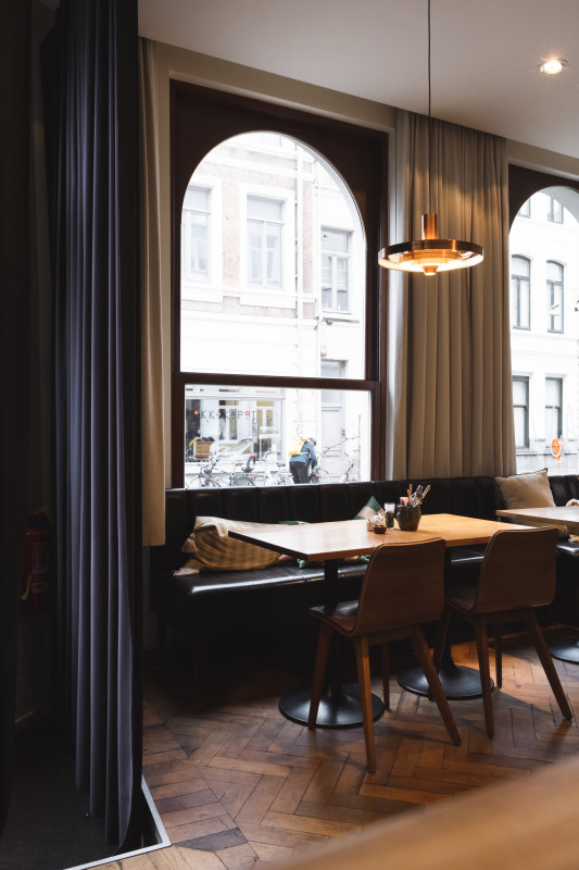 De zaak is ideaal gelegen aan het bruisende Moorkensplein. Het interieur met Parijse vintage-toets wordt gekenmerkt door kwalitatieve elementen zoals de mooie oude (gerecupereerde) eiken parketvloer in visgraat, de witte Parijse metrotegel achter de bar en in het sanitair, de koperen vintage lampen en de lederen stoelen en banken.