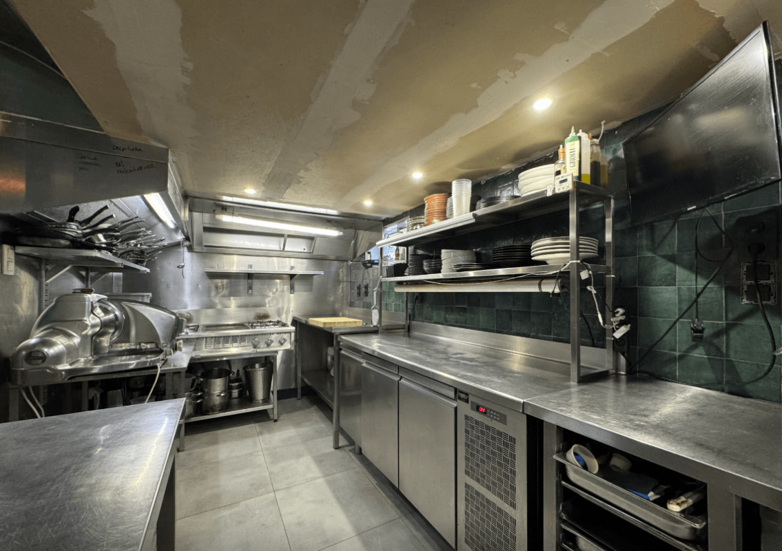 Ruime gelagzaal met 46 zitplaatsen - open bar - keuken uitgerust met professionele toestellen, diepvries en koelcel - een apart afwasgedeelte - sanitair - een polyvalente bovenruimte waar je eventueel kan wonen. In de ondergrond is er een grote kelder beschikbaar.