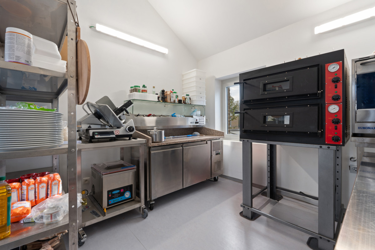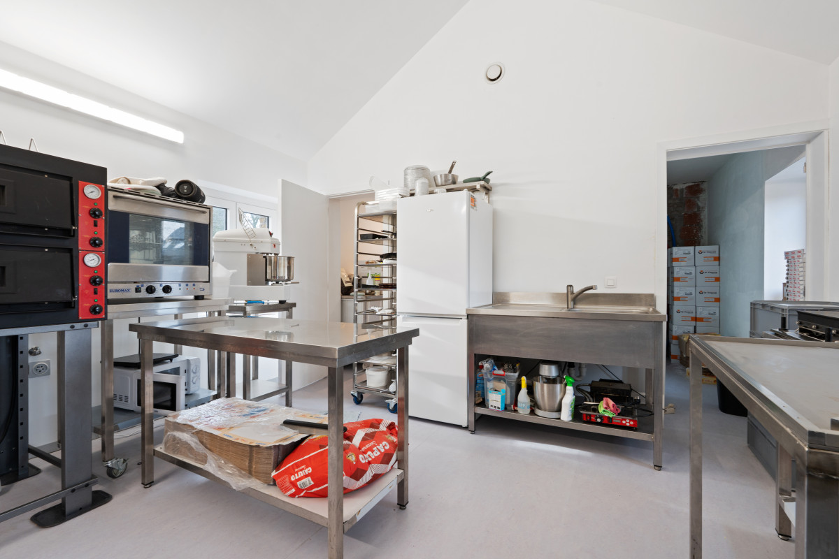 * eerste verdieping (30m²): professioneel ingerichte keuken én veel lichtinval, waar ondermeer de verse pizza's worden gemaakt /afgebakken. Deze ruimte kan ook perfect dienen als privégedeelte.