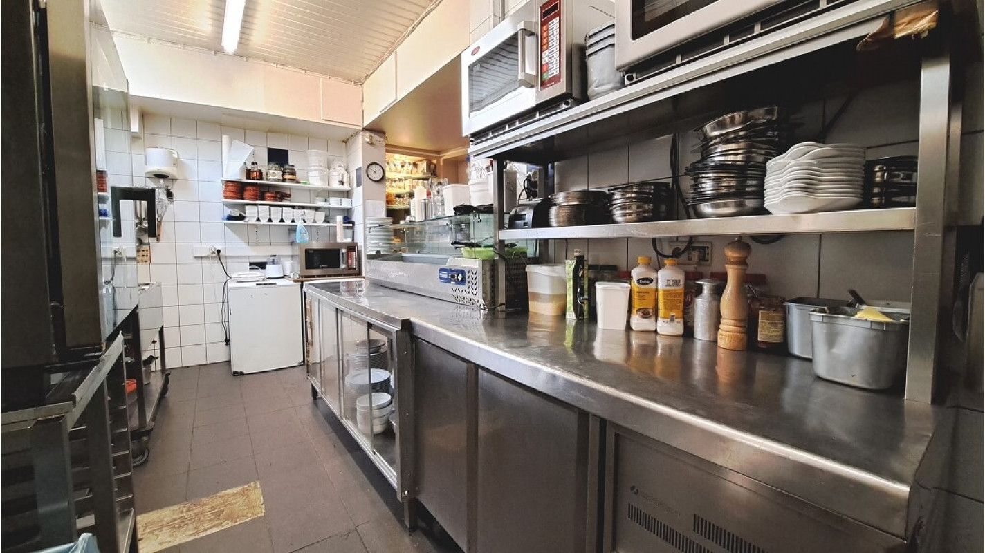 Omvat een gelagzaal met bar en veranda-terras met een capaciteit van 64 zitplaatsen, een overdekt buitenterras met een capaciteit van 36 zitplaatsen, warme- en koude keuken met afwasruimte. Verder is er ook nog een kelderverdieping met bergruimte en toiletten.