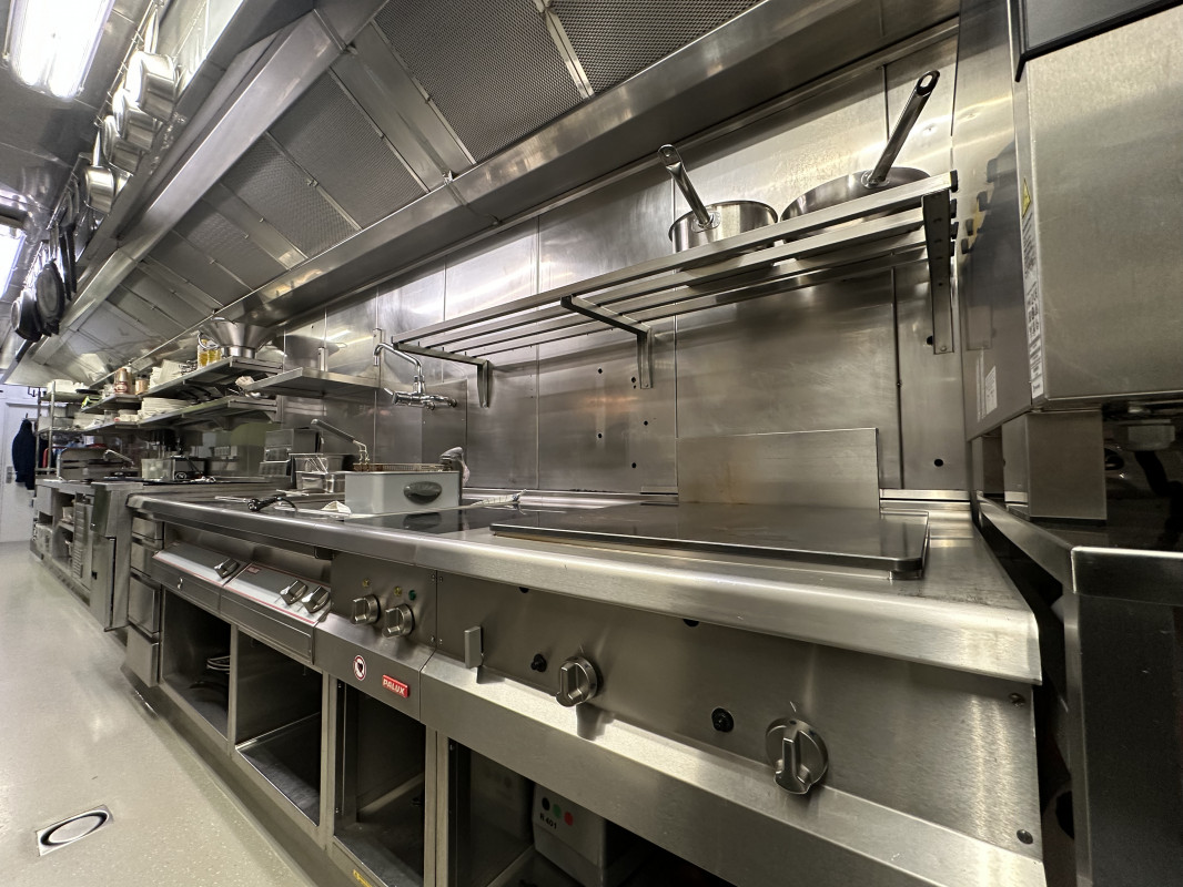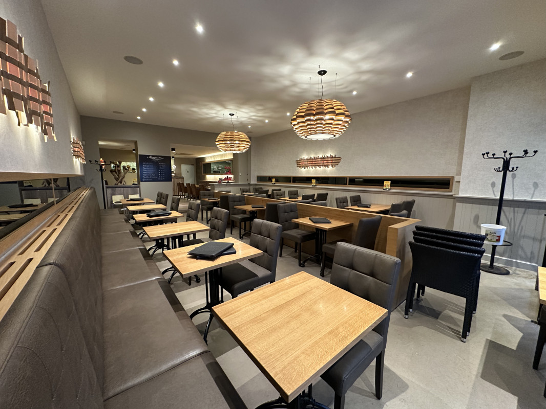 Omvat een terras met plaats voor 28 personen, gelagzaal met open bar met een capaciteit van 62 personen, volledig ingerichte open keuken, kelder, afzonderlijke ingang voor leveranciers met containerstaanplaats, toiletten, tussenverdiep met stockageruimte en kleedkamer personeel.