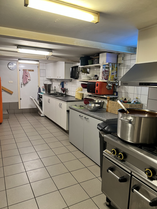er is ook nog een kelder verdieping aan het gebouw, waar zich de keuken voor de bereidingen bevind, met een kookfornuis, oven voor de broodjes, vaatwas machine en bergingen voor de dranken en andere toebehoren zoals de vriescel en koelcel.