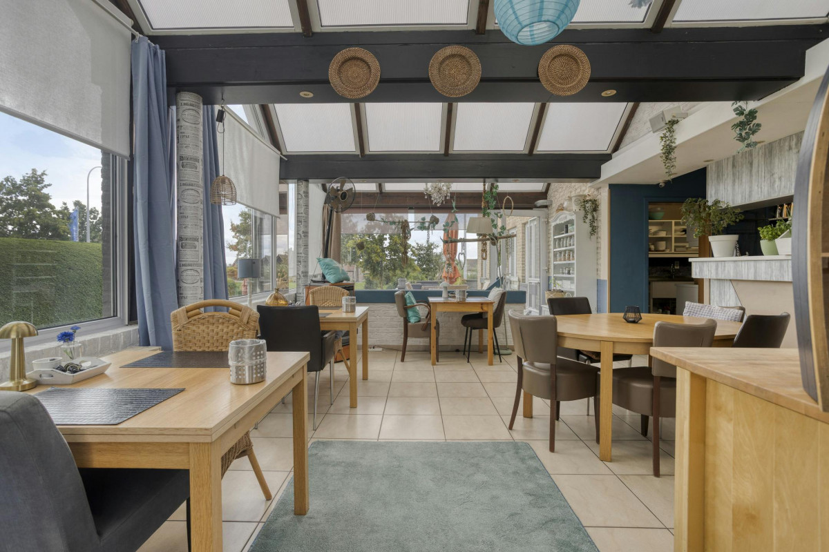 Gelijkvloers : onthaal/receptie, ontbijtruimte met keuken en koelkamer, toiletten, 4 tweepersoonskamers met badkamer - terras