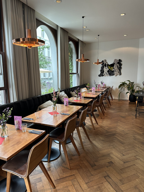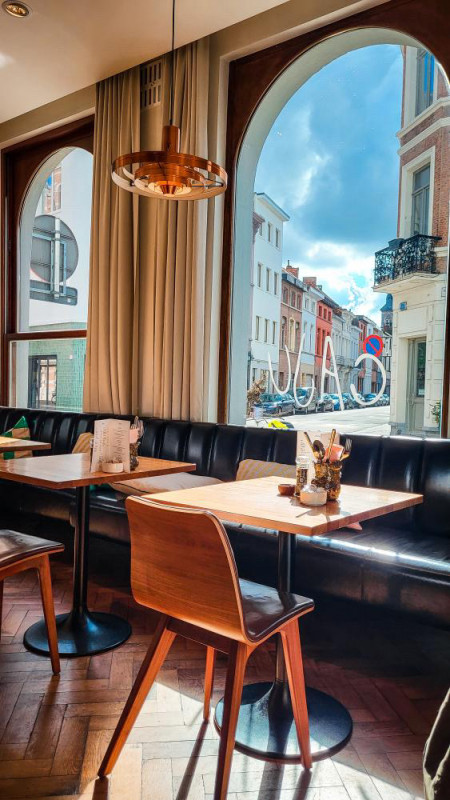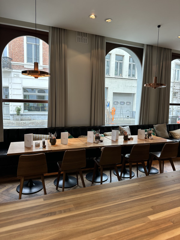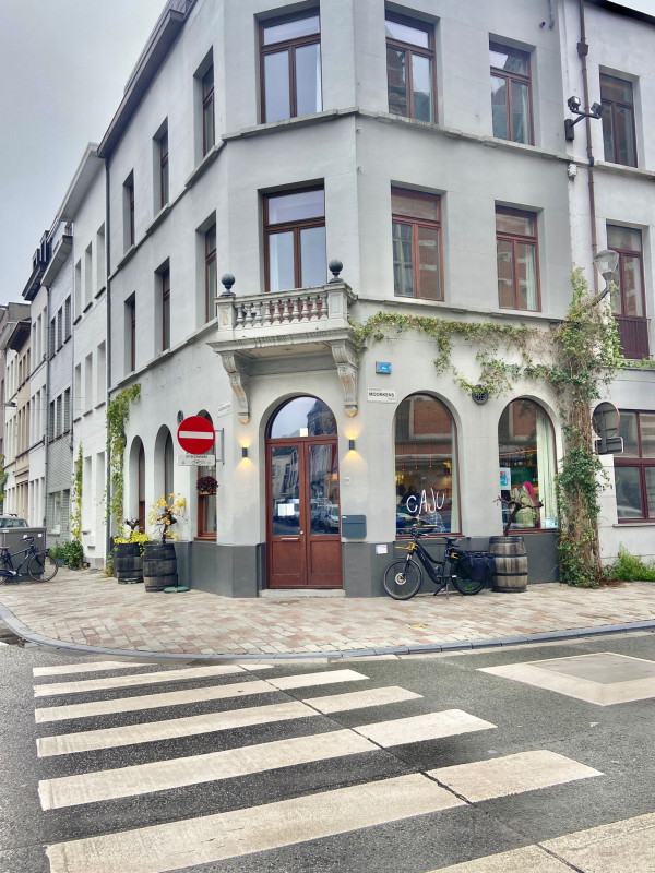 De zaak is ideaal gelegen aan het bruisende Moorkensplein. Het interieur met Parijse vintage-toets wordt gekenmerkt door kwalitatieve elementen zoals de mooie oude (gerecupereerde) eiken parketvloer in visgraat, de witte Parijse metrotegel achter de bar en in het sanitair, de koperen vintage lampen en de lederen stoelen en banken.