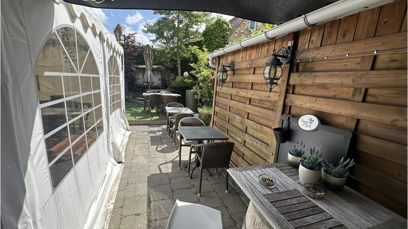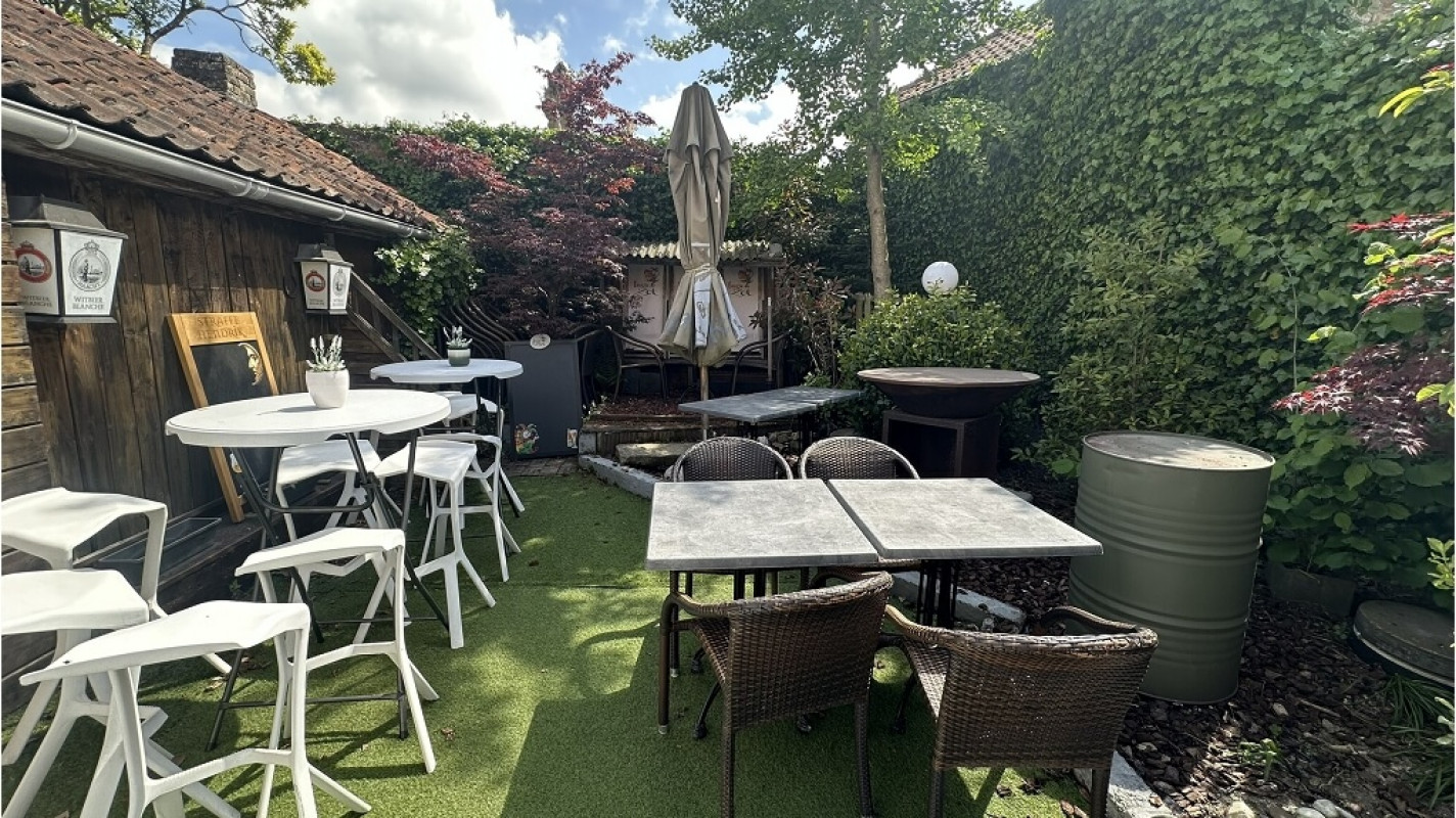 Omvat een gelagzaal met bar met een capaciteit 34 personen, warme en koude keuken, afwasruimte, 3 bergingen, toiletten en een tuin met een overdekt gedeelte ( cap. 25 personen ) en een niet overdekt gedeelte voor 10 personen. Op de eerste verdieping is er een bureel en 3 opslagruimtes aanwezig.