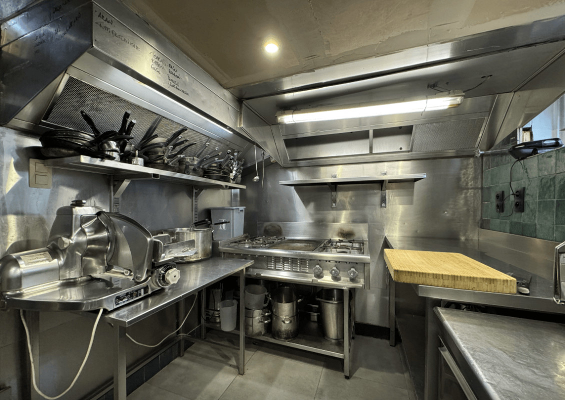 Ruime gelagzaal met 46 zitplaatsen - open bar - keuken uitgerust met professionele toestellen, diepvries en koelcel - een apart afwasgedeelte - sanitair - een polyvalente bovenruimte waar je eventueel kan wonen. In de ondergrond is er een grote kelder beschikbaar.