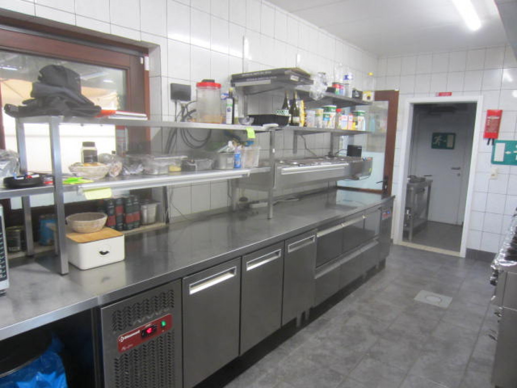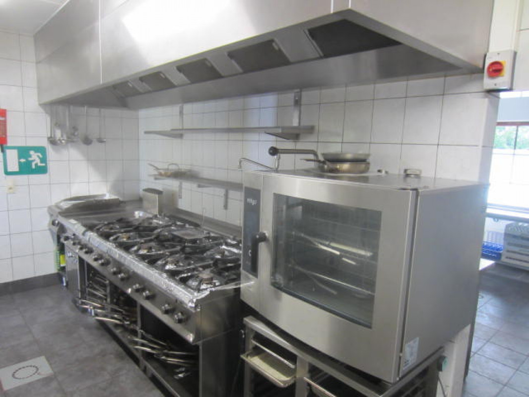 Een geïnstalleerde keuken met degelijk en nieuw materiaal met een combisteamer merk Retigo, een aparte gedeelte voor de pizza's, afwaskeuken, koelcel en frigo.