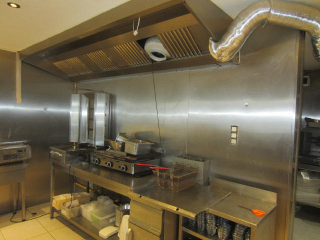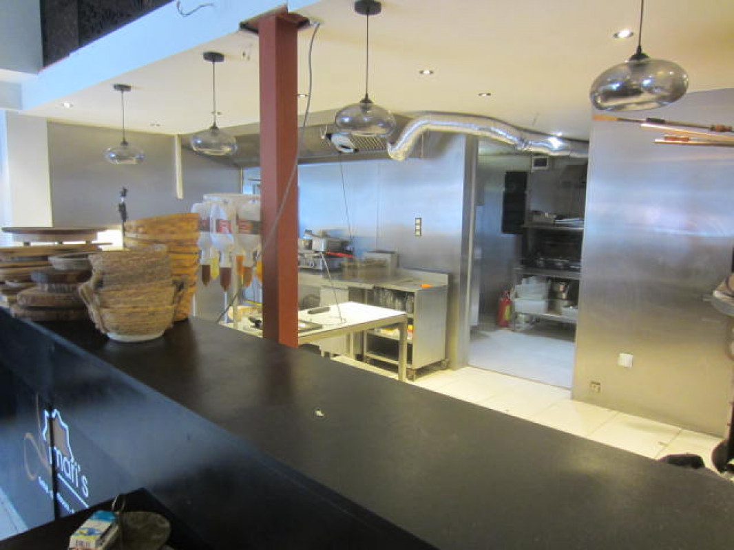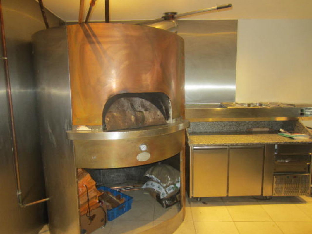 Een terras tafeltje aan de inkom en een ruime open keuken achter de toonbank met pizzaoven , aparte afwaskeuken met koel - en diepvrieskast .